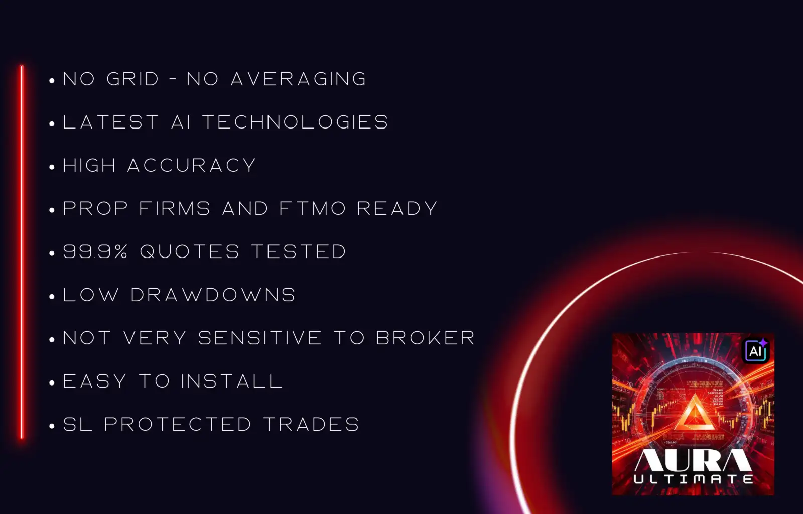 Aura Ultimate EA MT5 is a professional, future-ready neural network trading system built for traders who demand transparency, adaptability, and strict risk control. With its multi-strategy architecture, AI-driven market perception, and prop-firm-ready design, it stands out as a powerful solution for automated XAUUSD trading.