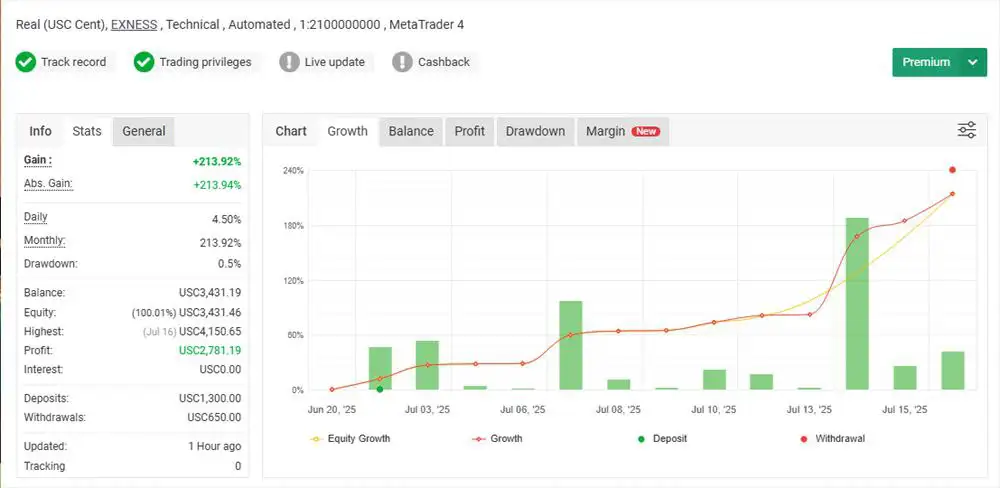 While the EA employs risk-aware systems, it includes a limited two-level martingale backup module (e.g., 0.01 → 0.15 lots maximum).