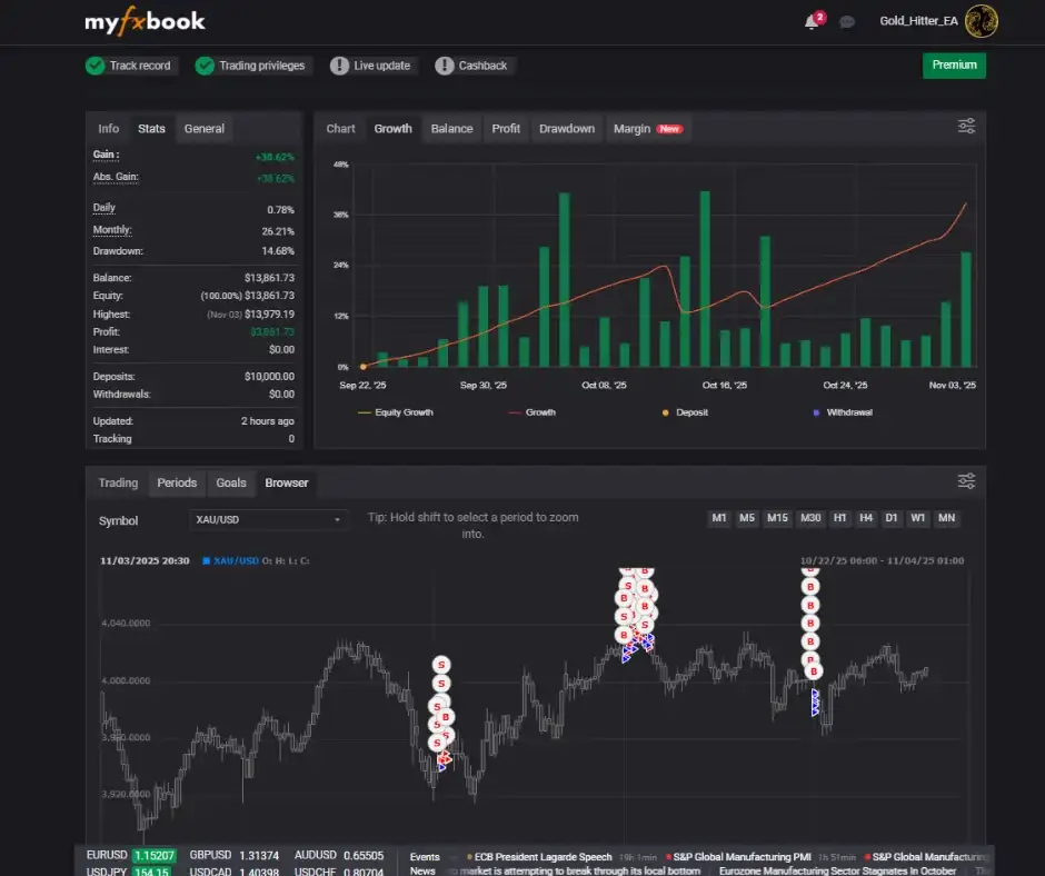 With MyFxBook-verified results and two optimized performance modes, Gold Hitter EA MT4 is suitable for both personal accounts and prop-firm challenges.