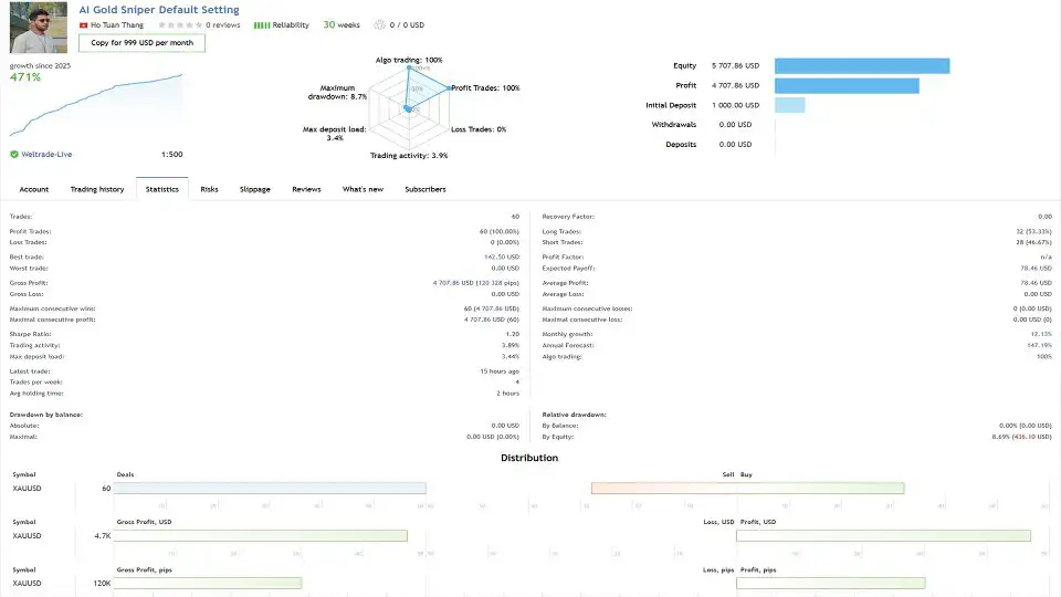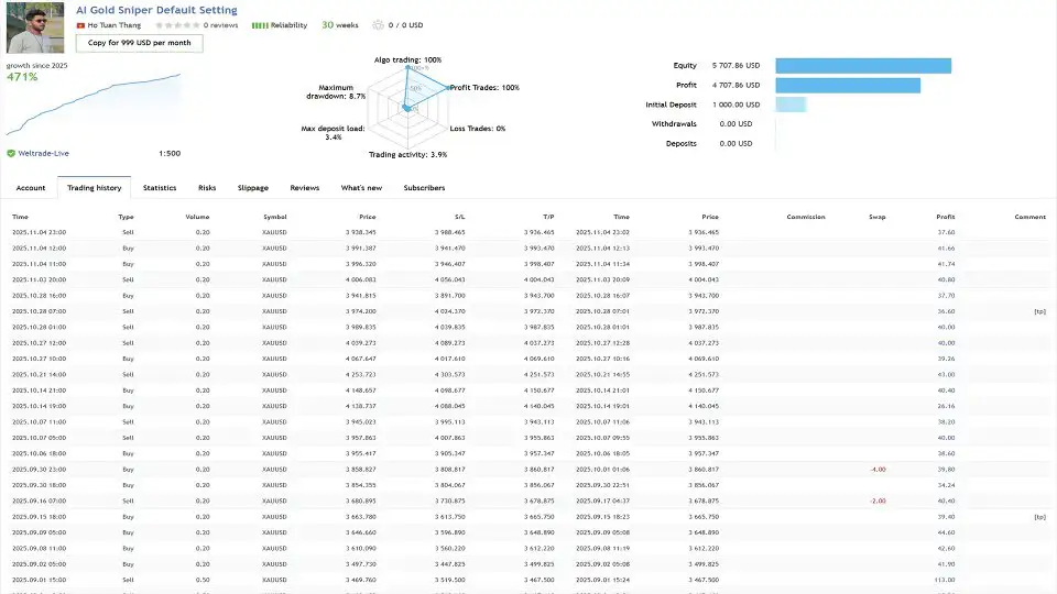 این معامله هوشمند XAUUSD مبتنی بر هوش مصنوعی و مدیریت ریسک ساختارمند است.