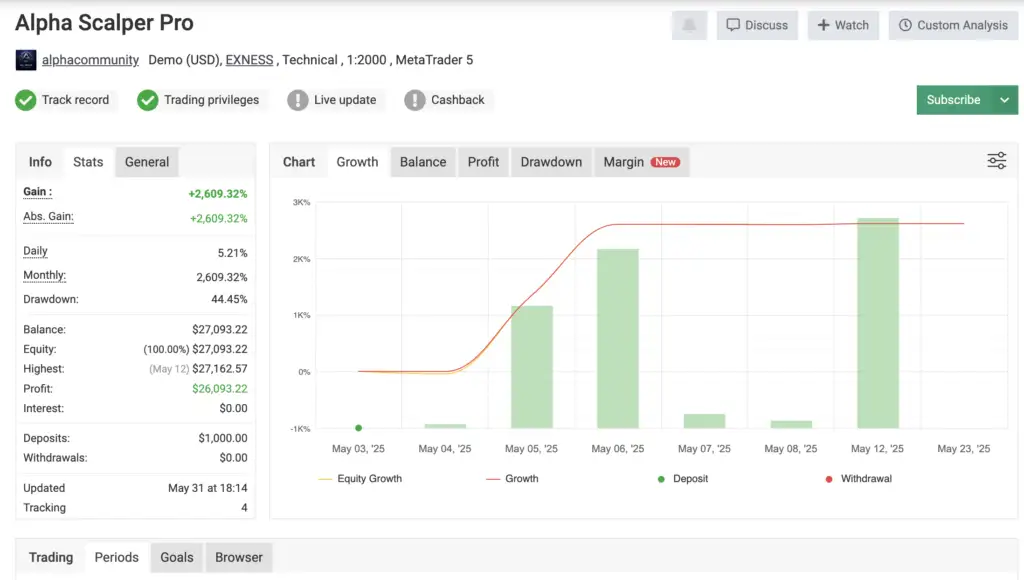 - موتور رشد سریع حساب – بهینهسازی شده برای رشد سریع حسابهای کوچک با استفاده از استکینگ هوشمند، ورودهای پرتعداد و کامپاندینگ. ایدهآل برای چالشهای پراپ فیر یا رشد تهاجمی حساب شخصی.