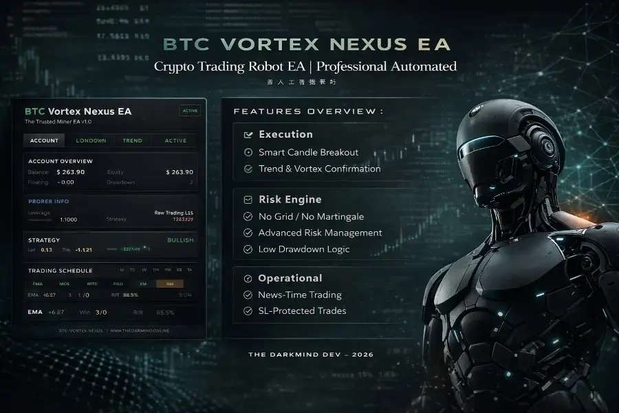 BTC Vortex Nexus EA MT5 یک اکسپرت کاملاً خودکار است که بهصورت اختصاصی برای نماد BTCUSD در پلتفرم متاتریدر 5 طراحی شده است. این سیستم با تمرکز بر معاملات شکستهای ساختاری (Breakout) و با رعایت دقت، انضباط و مدیریت ریسک سختگیرانه توسعه یافته است.