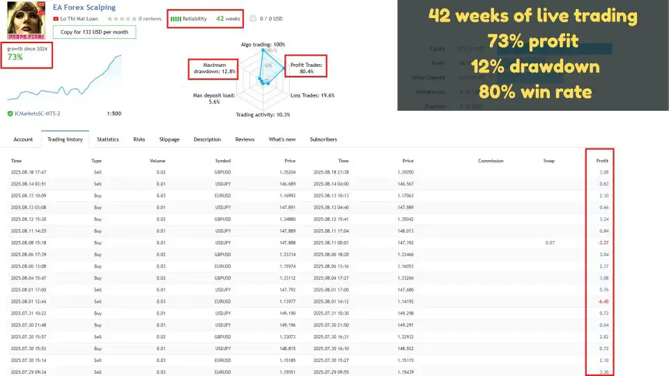 با بیش از ۶ ماه عملکرد موفق در حسابهای واقعی و ۱۰ تا ۲۰ سال بکتست دقیق، EA Forex Scalper MT4 ثابت کرده است که میتواند در شرایط مختلف بازار کارایی و ثبات خود را حفظ کند.
