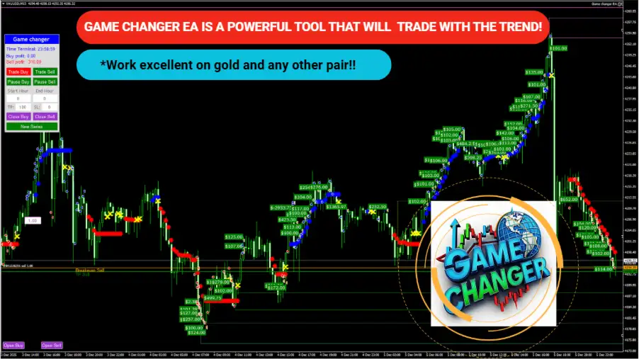 اگر بهدنبال یک ربات معاملاتی حرفهای برای متاتریدر 4 هستید که در بازارهای رونددار—بهویژه طلا—عملکرد درخشانی داشته باشد، EA Game Changer MT4 میتواند ابزار قدرتمندی برای ارتقای سطح معاملات شما باشد.