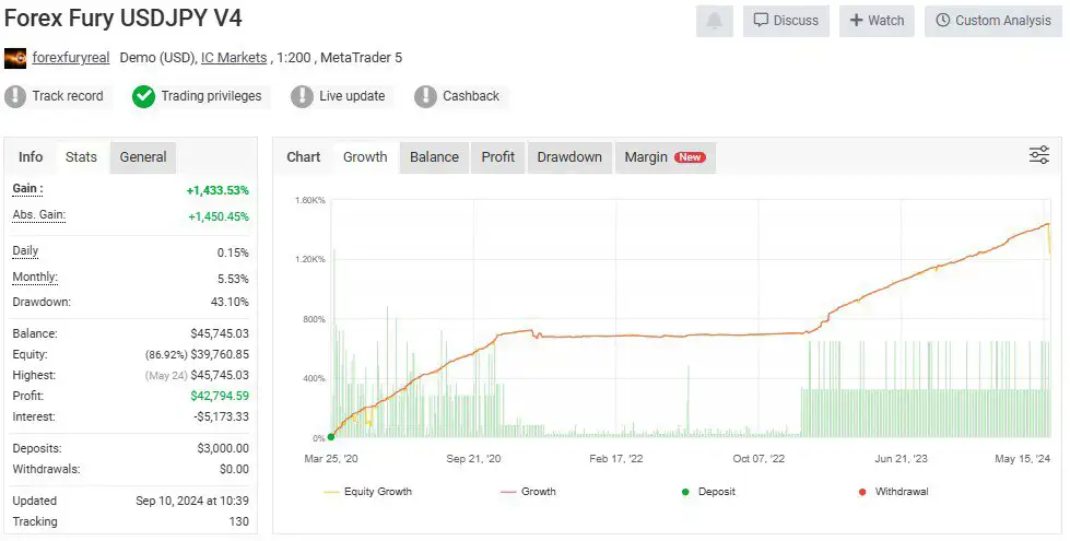 Forex Fury MT4 یک اکسپرت بسیار قدرتمند و مورد اعتماد است که برای پلتفرم MetaTrader 4 (MT4) طراحی شده و تعادل کاملی بین کنترل ریسک و کسب سود ایجاد میکند. فرقی نمیکند که یک معاملهگر تازهکار باشید یا حرفهای، این نرمافزار ابزارها و انعطاف لازم را برای رشد حساب معاملاتی شما با اعتمادبهنفس، ثبات و راحتی فراهم میسازد.