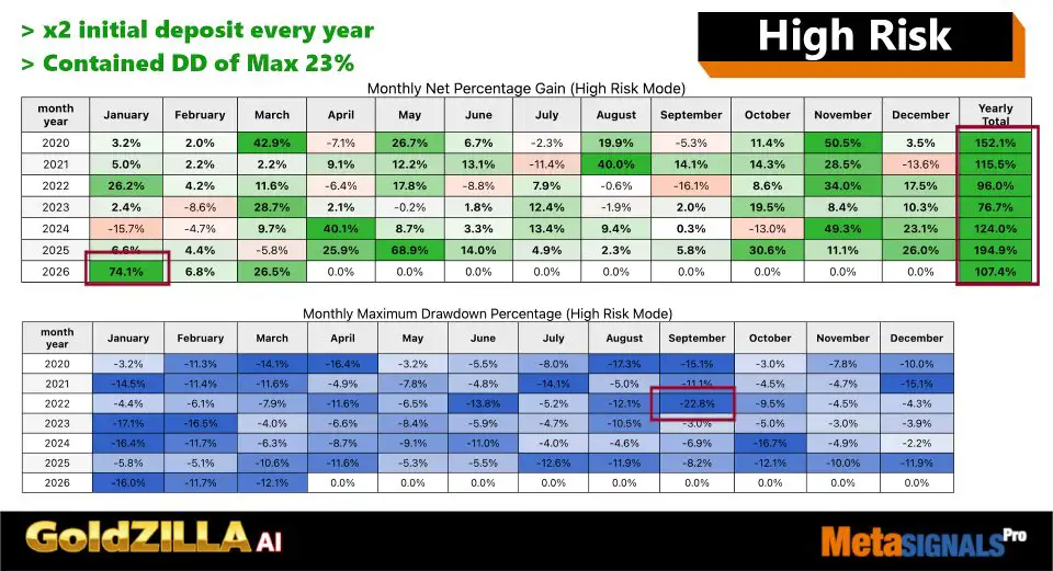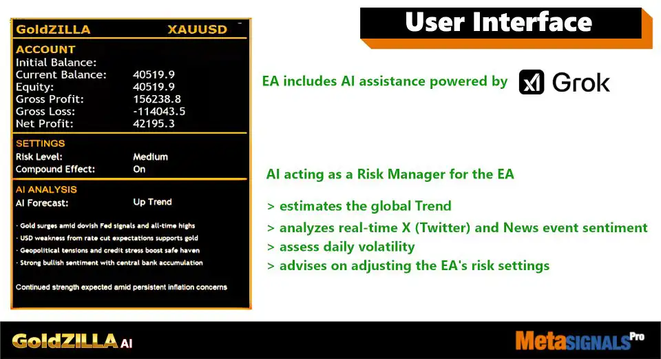 Gold Zilla AI MT4 بهعنوان یک ربات پیشرفته، ترکیبی از هوش مصنوعی، اجرای چنداستراتژی و مدیریت ریسک دقیق را ارائه میدهد.