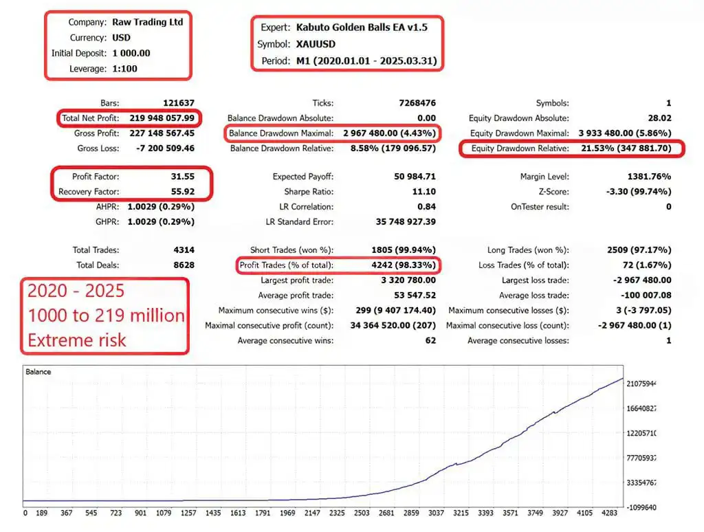 Kabuto Golden Balls EA یک اکسپرت قدرتمند و پیشرفته است که بهطور اختصاصی برای معاملات XAUUSD (طلا) روی پلتفرم MetaTrader 5 (MT5) طراحی شده است. این ربات با بهرهگیری از سیستم هوشمند LOT_TYPE_SMART_MM_MarkII در حالت LOW_RISK_STABLE توانسته ترکیبی بینظیر از سودآوری بالا و کنترل ریسک را ارائه دهد.