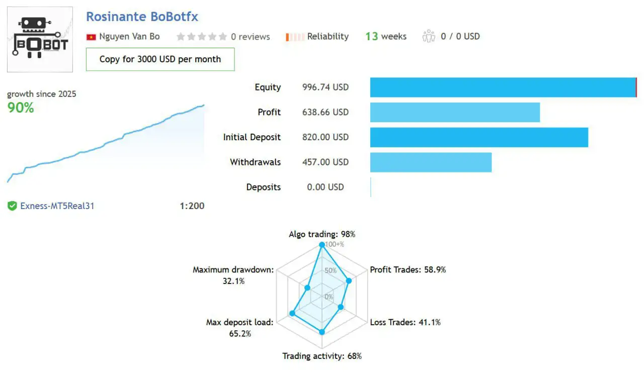 یکی از مهمترین مزایای Rosinante EA MT5 نیاز به سرمایه اولیه پایین است که امکان شروع معامله خودکار طلا را تنها با 100 دلار فراهم میکند. با وجود این دسترسی آسان، اکسپرت دارای آمار معاملات زنده و تأییدشده است که به کاربران اجازه میدهد عملکرد واقعی سیستم را پیش از استفاده بررسی کنند.