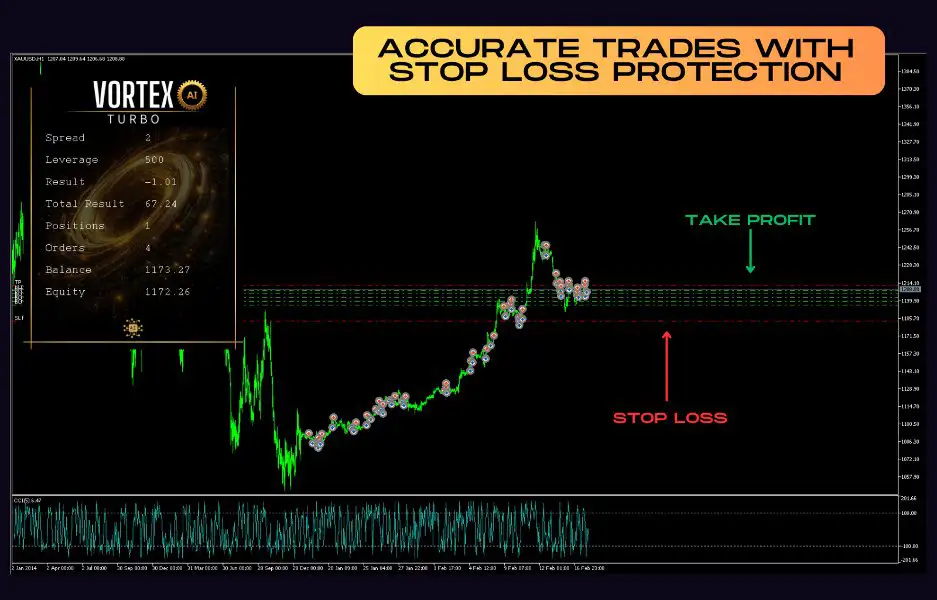 اگرچه Vortex Turbo از مکانیزم میانگینگیری و مارتینگل استفاده میکند، اما هر معامله شامل موارد زیر است: