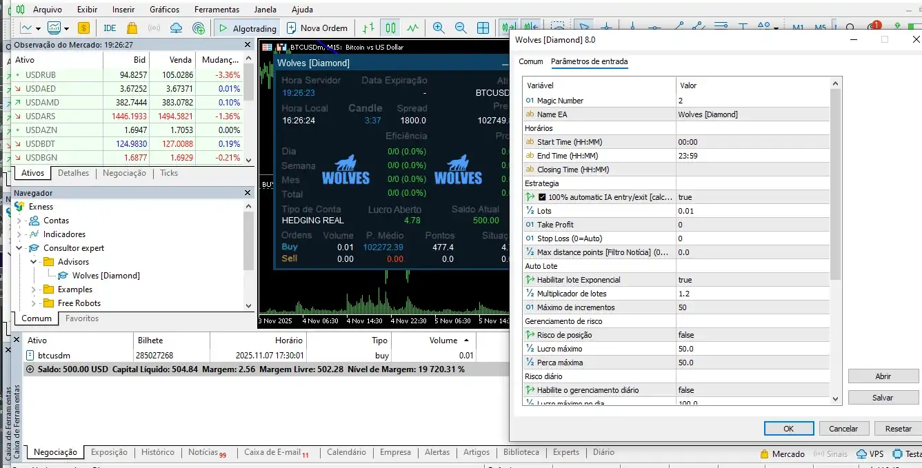 Wolves Diamond EA MT5 بهصورت اختصاصی برای معامله BTCUSD بهینهسازی شده و بهترین عملکرد را با بروکرهای معتبر و دارای نقدشوندگی بالا ارائه میدهد. برای اجرای دقیقتر، استفاده از بروکرهایی مانند Exness، PU Prime یا بروکرهای معتبر مشابه توصیه میشود.