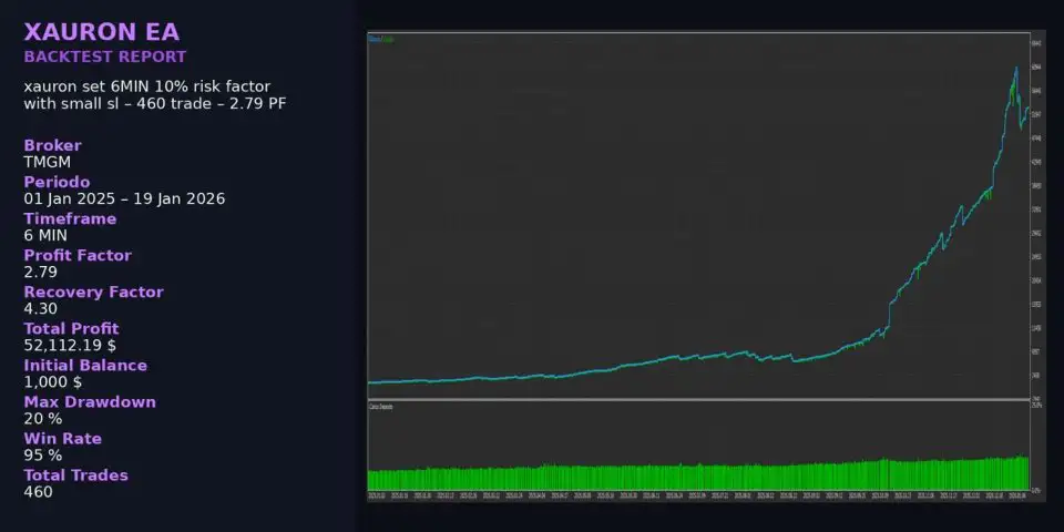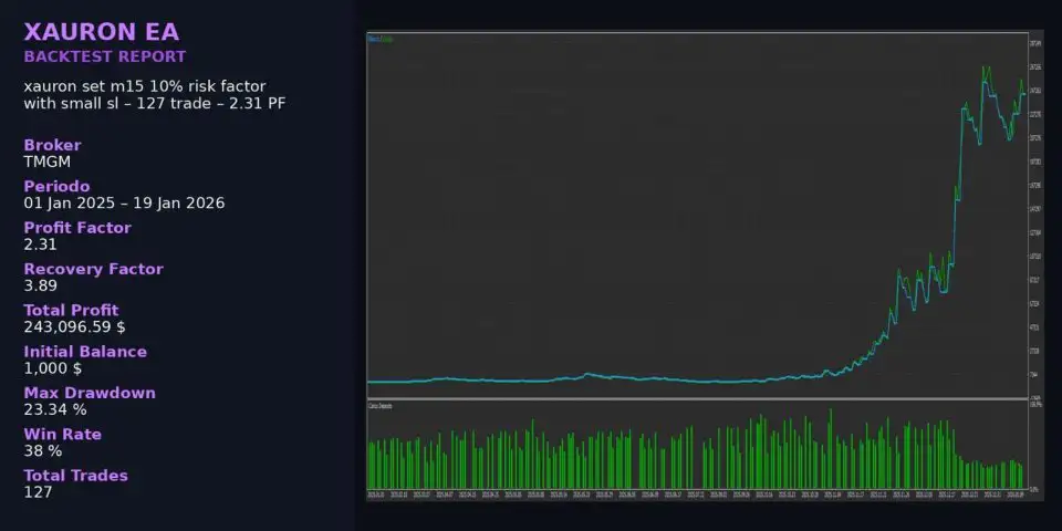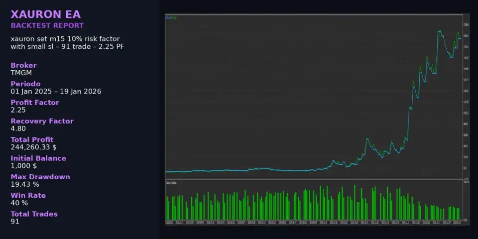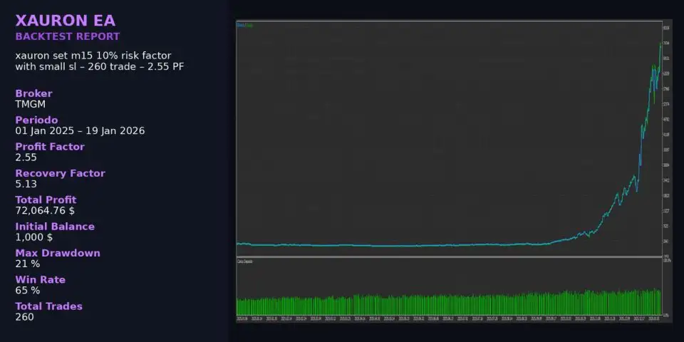 این اکسپرت بهصورت پویا شرایط بازار را تحلیل میکند تا تغییرات احتمالی مومنتوم و فرصتهای بریکاوت را شناسایی کند. با ادغام چندین فیلتر تحلیلی، XAURON تلاش میکند تنها در شرایط با احتمال موفقیت بالا وارد معامله شود و در عین حال پارامترهای ریسک مشخصی را حفظ کند.